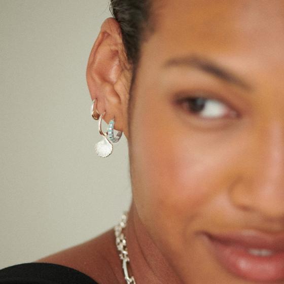 No introduction needed for the Shell Drop Earrings. Simple yet perfectly formed, crafted in recycled sterling silver, they feature a clam shell charm hung from a hoop earring and fasten with a butterfly. Talk about making an entrance; these are a definite head-turner.