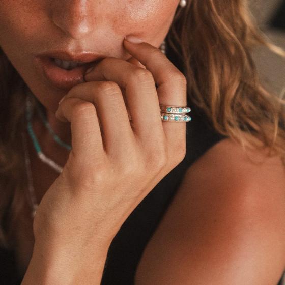 The Spanish islands meet city lunches with this one. Made from 100% recycled silver, turquoise beads and seed pearls are set on an organic band. This is the ring missing from your jewellery box. Double it up for statement style or pair with mixed band rings for a curated look.